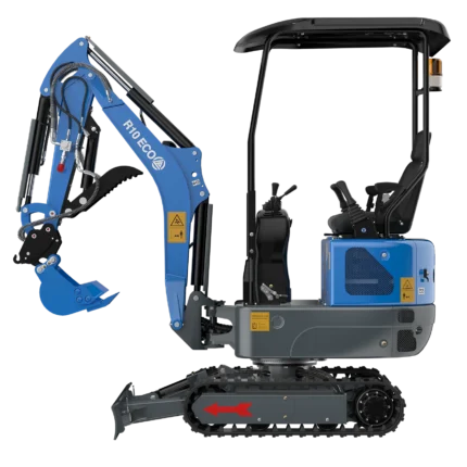 Joysticks latéraux Toit de protection Moteur KOOP/Kubota Flèche déportée et chenilles rétractables Pouce hydraulique + Attache rapide mécanique Godet d’origine 300 mm Manuel d'utilisation Rippa R10 ECO Brochure Rippa R10 ECO
